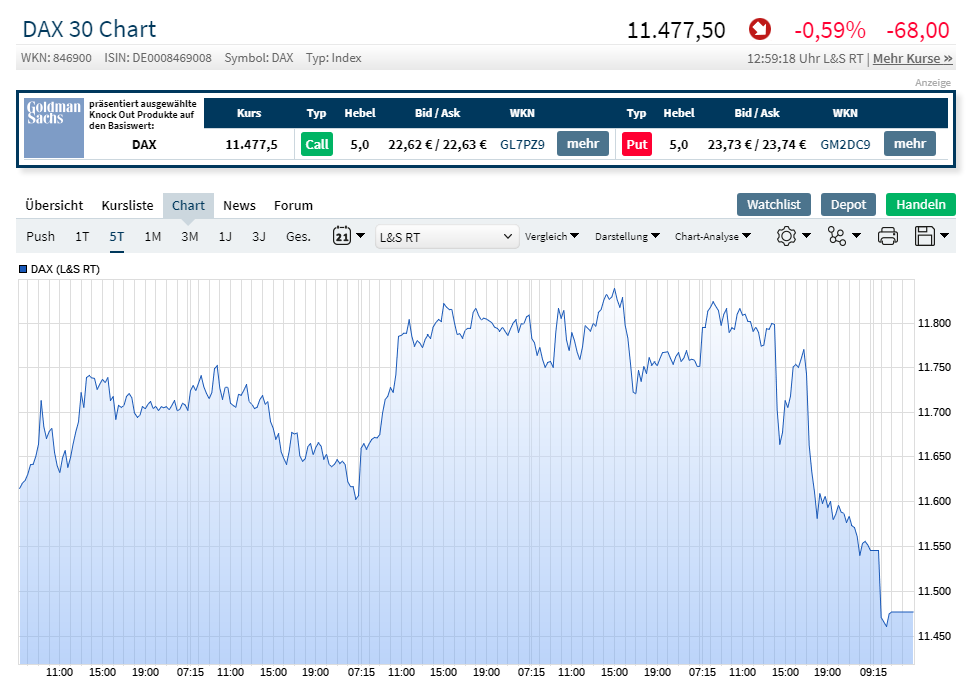 Der DAX® prallte am Freitag an der Widerstandsmarke von 11.825 Punkten ab und tauchte auf 11.630 Punkte ab. Zwischen 11.560/11.630 Punkte findet der Index eine starke Unterstützung. Solange diese Zone hält besteht die Chance auf einen Rebound bis 11.720/11.825 Punkte. Sinkt der Index unter 11.560 Punkte droht jedoch ein Rücksetzer bis 11.360 Punkte."