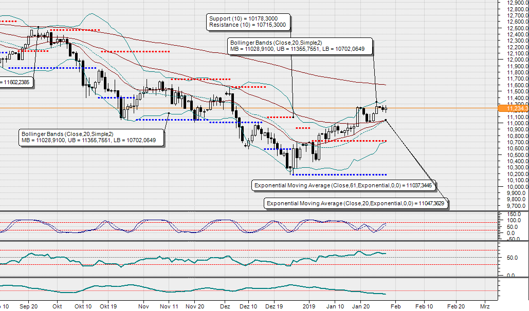 Der DAX® schlich heute nach einem schwachen Start von 11.160 auf 11.270 Punkte. Damit bleibt der kurzfristige Aufwärtstrend zunächst intakt. Der Weg nach oben bleibt dennoch steinig. Zwischen 11.300 und 11.640 Punkten zeigen sich zahlreiche Widerstandsmarken. Unterstützung findet der Index weiterhin zwischen 11.000 und 11.270 Punkten."