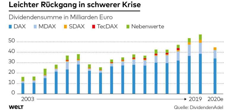 Bei anderen Firmen wie zum Beispiel den Autobauern ist es noch offen, ob sie ihre zum Teil deutlich reduzierten Dividenden wie vorgeschlagen zahlen oder am Ende doch noch ganz ausfallen lassen. Denn in der Krise könnte es schwer vermittelbar sein, warum zum Beispiel Kurzarbeiter in dem Sektor Geld vom Staat und den Sozialkassen erhalten, gleichzeitig aber Liquidität das Unternehmen verlässt, auch wenn beides nicht direkt etwas miteinander zu tun hat. Im Finanzsektor hat die Europäischen Zentralbank als Aufsichtsbehörde Dividendenzahlungen sogar faktisch untersagt. Bankaktionäre gehen also leer aus.
