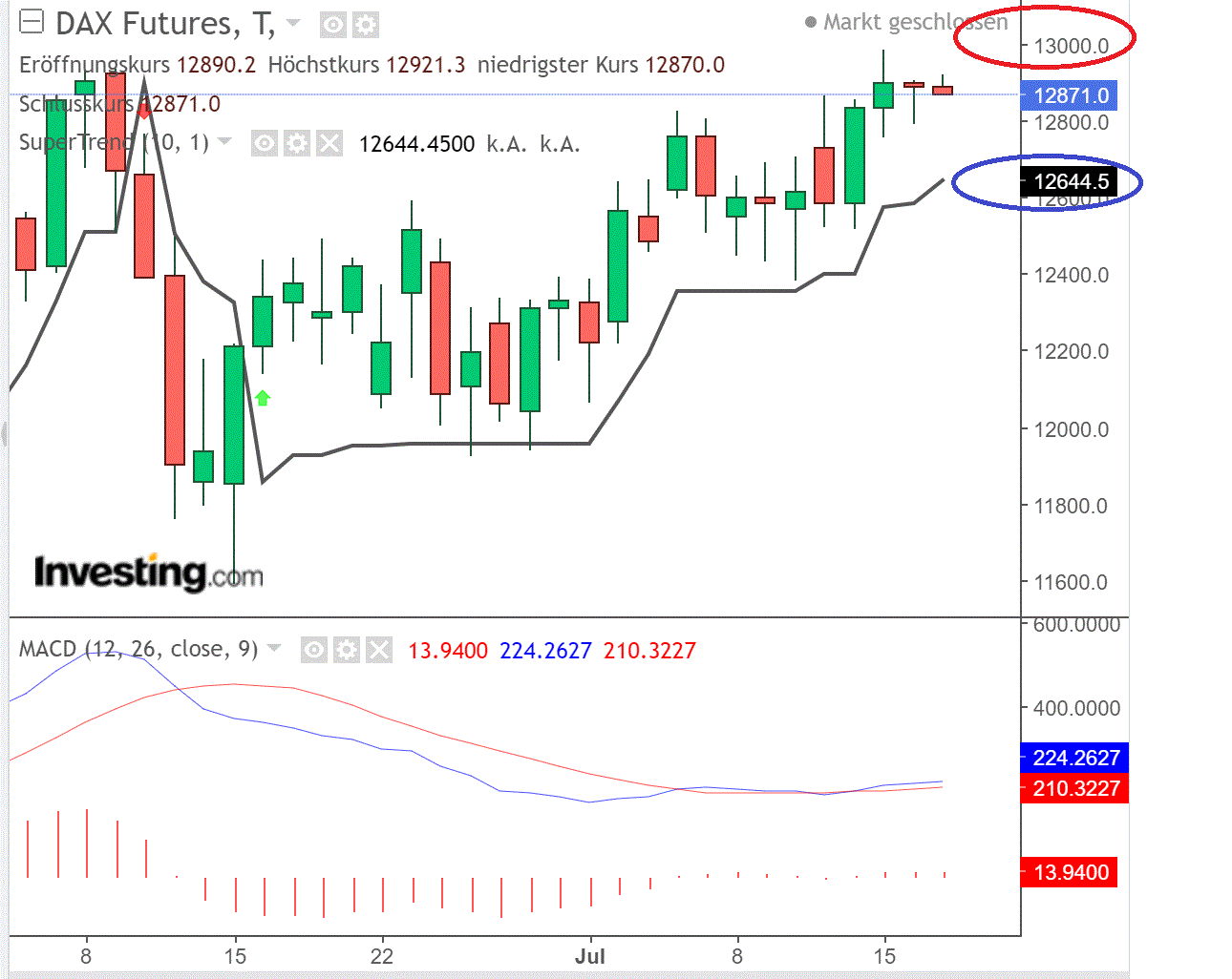 Nach einer schwachen Eröffnung pendelte der DAX® im Tagesverlauf zwischen 12.820 und 12.920 Punkten und schloss in der oberen Hälfte der Range. Damit bleibt der Aufwärtstrend weiter intakt. Im Bereich von 12.930 Punkten geht dem Index jedoch sichtlich die Puste aus. Gelingt jedoch der Ausbruch könnte der nächste Anlauf die 13.000 Punkte-Marke starten. Auf der Unterseite hat sich inzwischen eine breite Unterstützungszone gebildet. Ein nachhaltiger Stimmungswechsel dürfte sich frühestens unterhalb von 12.420 Punkte einstellen."