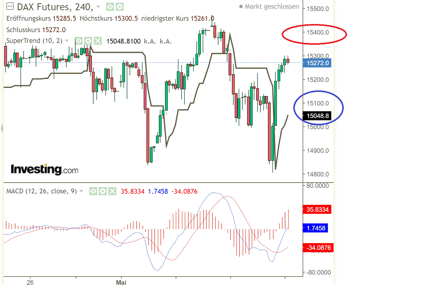 Widerstandsmarken: 15.260/15.335/15.440/15.510 Punkte