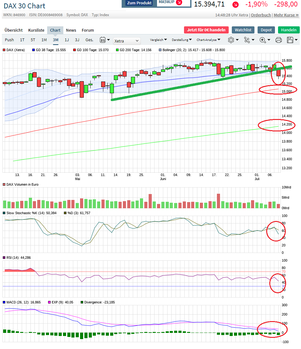 Die von vielen Beobachtern und Marktteilnehmern erwartete Korrektur nach monatelangem Höhenflug wird kommen, aber wenn sie beginnt, wie sähe das denn aus ? Gut möglich: genau so wie das, was heute passiert ! Und dann zwei oder drei schwache Folgetage von jeweils - 2 oder - 3 Prozent oder sogar noch mehr und zB die wichtige Unterstützungslinie 14800 wäre erreicht oder sogar durchbrochen.