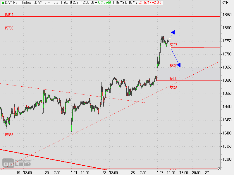 Vorbörslich drehen die Bullen einmal mehr auf. Der Index wird um 15.600 Punkte taxiert. Damit ist der Weg in Richtung 15.696 Punkte bzw. in Richtung des Allzeithochs bei 15.701 Punkten frei. Auf der Unterseite bleibt der Support bei 15.352 Punkten wichtig. Fällt er, könnte der Index in Richtung 15.184 bis 15.142 Punkte korrigieren. Auch ist der Nasdaq 100 um 15.000 Punkte gut abgesichert.