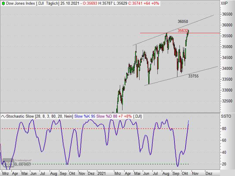 "Der Dow Jones stieg auch zum Start der neuen Handelswoche auf ein neues Allzeithoch und hämmerte zudem die achte weiße Tageskerze in Folge in den Chart. Die Marke von 35.631 Punkten wurde mit einem Tagestief bei 35.629 Punkten als Support bestätigt.