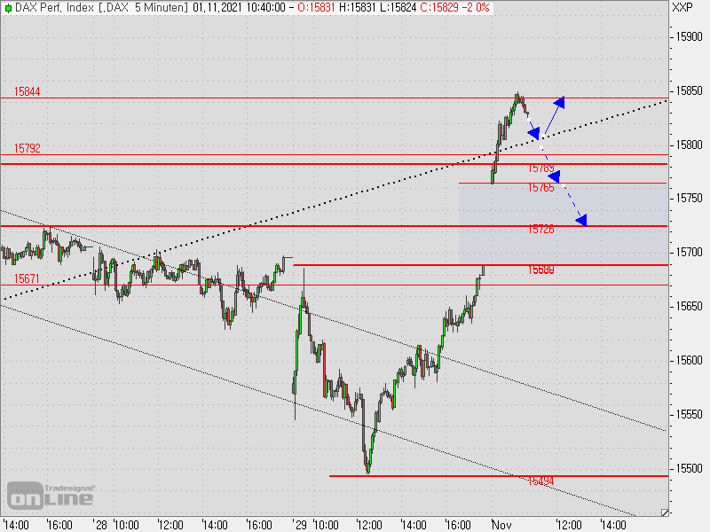 Per Tagesschluss konnten damit auch die Unterstützungsthemen 50-Tage-Linie, 100-Tage-Linie und Kurslücke vom Dienstag (15.619) verteidigt werden. Die Chance auf eine zeitnahe Fortsetzung des vom Oktober-Tief (14.819) ausgehenden Aufwärtstrends bleibt daher erhalten. Saisonal betrachtet zeigt der DAX im November/Dezember-Zeitraum typischerweise deutliche Stärke. Nächste Unterstützungen liegen bei 15.598-15.619 Punkten, 15.546/15.550 Punkten und 15.496 Punkten. Darunter käme es zu einer Eintrübung des kurzfristigen Chartbildes mit nächstem potenziellem Ziel bei 15.383/15.407 Punkten. Mit Blick auf die Oberseite ist die Widerstandszone 15.704/15.724 Punkte relevant. Darüber würden fortgesetzte Kursavancen in Richtung zunächst 15.781/15.792 Punkte und 15.827 Punkte möglich. Die nachhaltige Überwindung der letztgenannten Marke würde schließlich ein bullishes Anschlusssignal im Rahmen des mittelfristigen Erholungstrends senden. Im Fokus bleibt perspektivisch das Rekordhoch bei 16.030 Punkten als primäres Kursziel. Zwischenziele lauten weiterhin 15.870 Punkte, 15.919 Punkte und 15.960 Punkte."