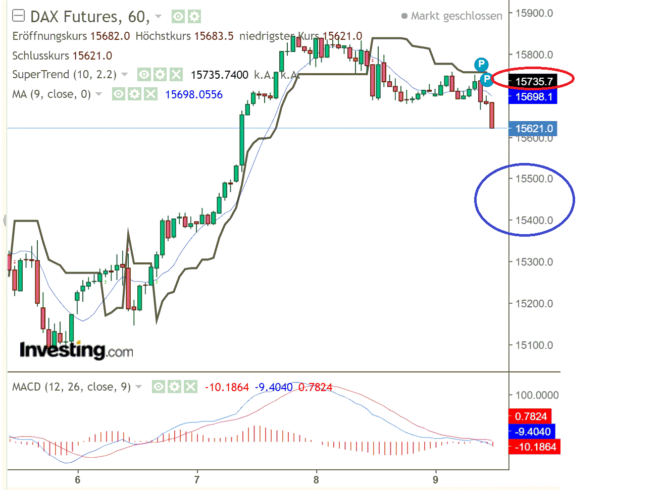 DAX Unterstützungen: 15660/15653 + 15587/15560 + 15510 + 15444 + 15323 + 15240