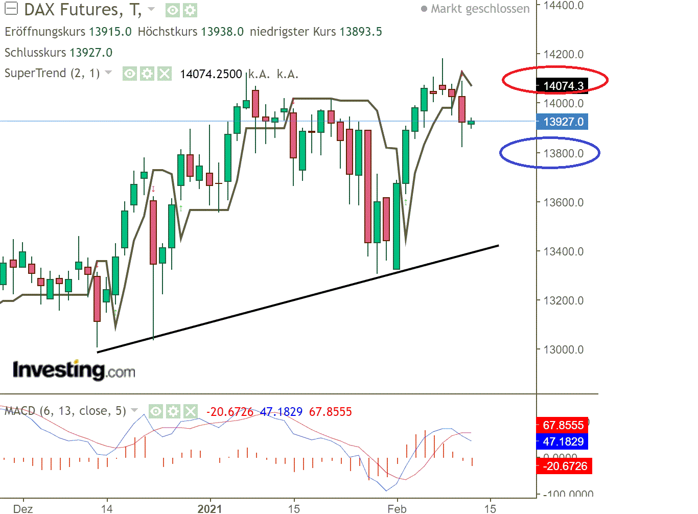 Quelle: Tagesausblick für 11.02.: DAX erneut schwächer. Thyssen und Varta stark! - Kolumnen - ARIVA.DE"XETRA DAX Vortagesschlusskurs: 13933