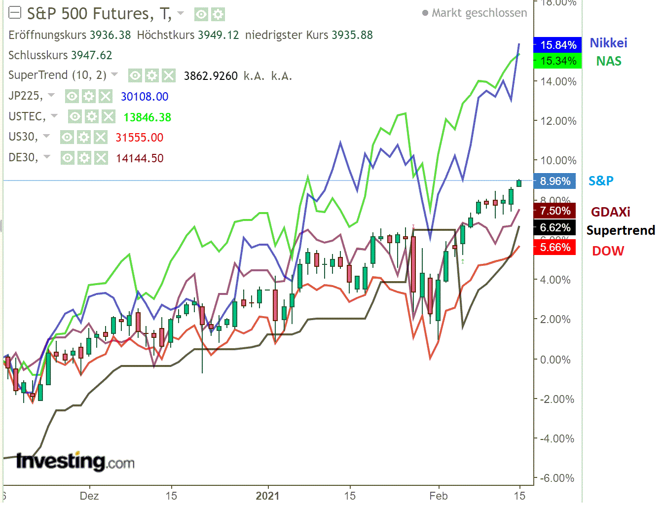 Zwar machte der Dow auch nach dem Montag neue Hochs. Allerdings verlief das doch sehr verhalten und immer wieder unterbrochen von deutlichen Intraday-Rücksetzern, die allerdings immer wieder gekauft worden. So zeigen Dienstag, Mittwoch und Donnerstag entsprechende Lunten bei den Tageskerzen.