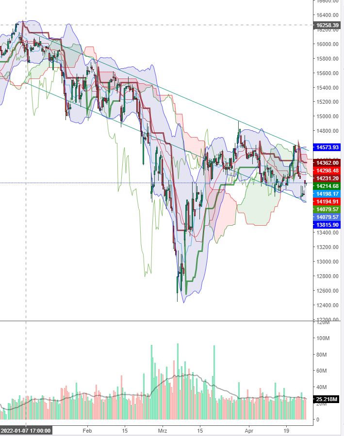 Kurzfristig ist auch hier die Situation neutral. 13.663 bis 13.725 Punkte bilden eine Widerstandszone. Darüber werden Gewinne in Richtung 13.880 Punkte möglich. Auf der Unterseite könnte der Index dagegen unterhalb von 13.240 Punkten die Ziele bei 13.129 und 13.002 Punkten doch noch erreichen. Unterhalb von 13.000 Punkten drohen starke Verkaufssignale.
