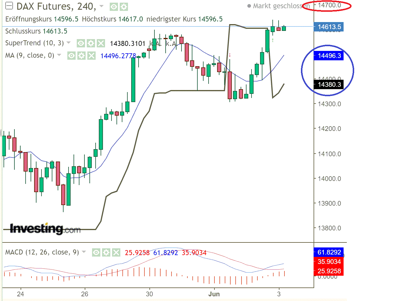 Der Dax ist auf dem Weg zur 14.603/14.605, geht er nachhaltig darüber, sind die Daxbullen klar im Vorteil. Aber morgen gibt es die NFP-Zahlen, da wäre ggf. eine noch größerere Konsolidierung drin. Abwarten!!