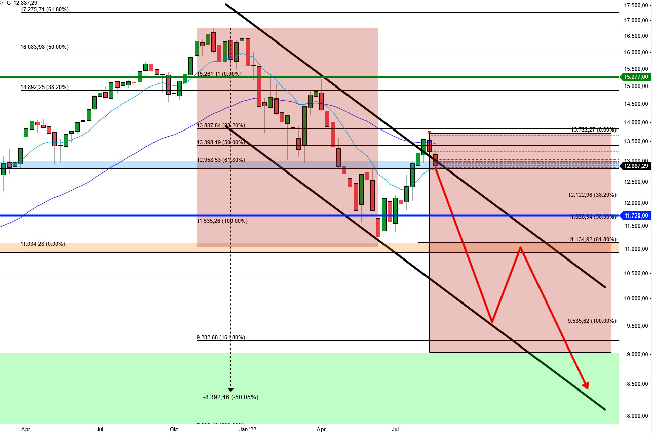 Der Nasdaq-100 verzeichnete mit einem Minus von 2,66 % die größten Verluste am gestrigen Handelstag. Dabei wurde der präferierte Zielbereich bei 12.762 – 12.892 Punkten angelaufen und der EMA200 unterschritten.