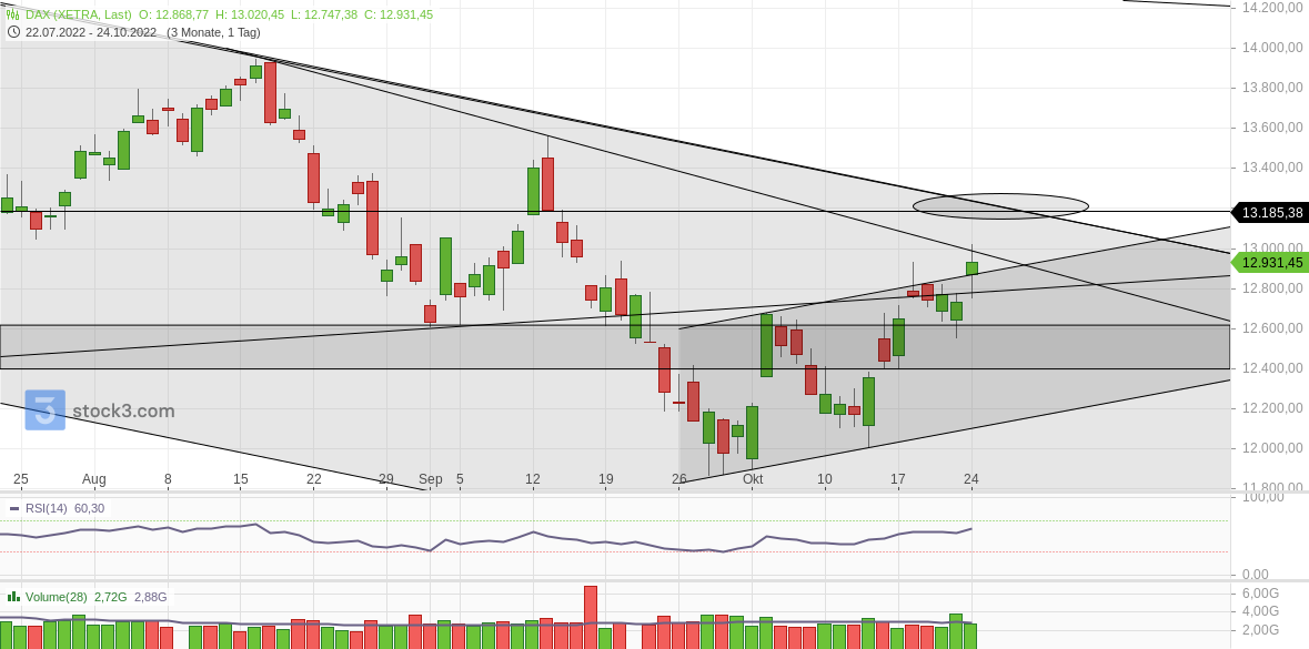 Der DAX hat gestern seine Chance genutzt, er stieg, von 12731 kommend, stark an, erreichte das Mindestziel, das Vorwochenhoch bei 12932 und auch gleich noch den Abwärtstrend vom Sommerhoch bei 13020.