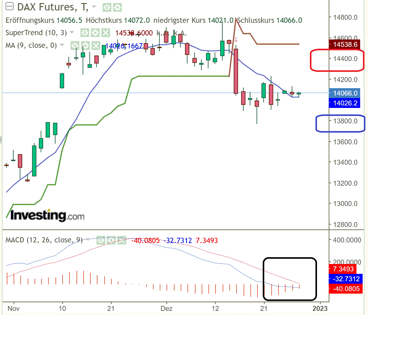 Heute am ersten Handelstag nach Weihnachten notieren die US-Futures deutlich im Plus. Das würde das bullische Bild von letzter Woche unterstützen. Oberhalb von 32.660 Punkten wird mit einem Anstieg bis ca. 33.500 Punkten gerechnet. Ein Tagesschlusskurs über 33.500 Punkten würde weiteres Aufwärtspotential generieren. Ein Rückfall unter 32.500 Punkten würde den Verkaufsdruck noch einmal deutlich erhöhen und womöglich zu einem Test der runden 32.000-Punkte-Marke führen.