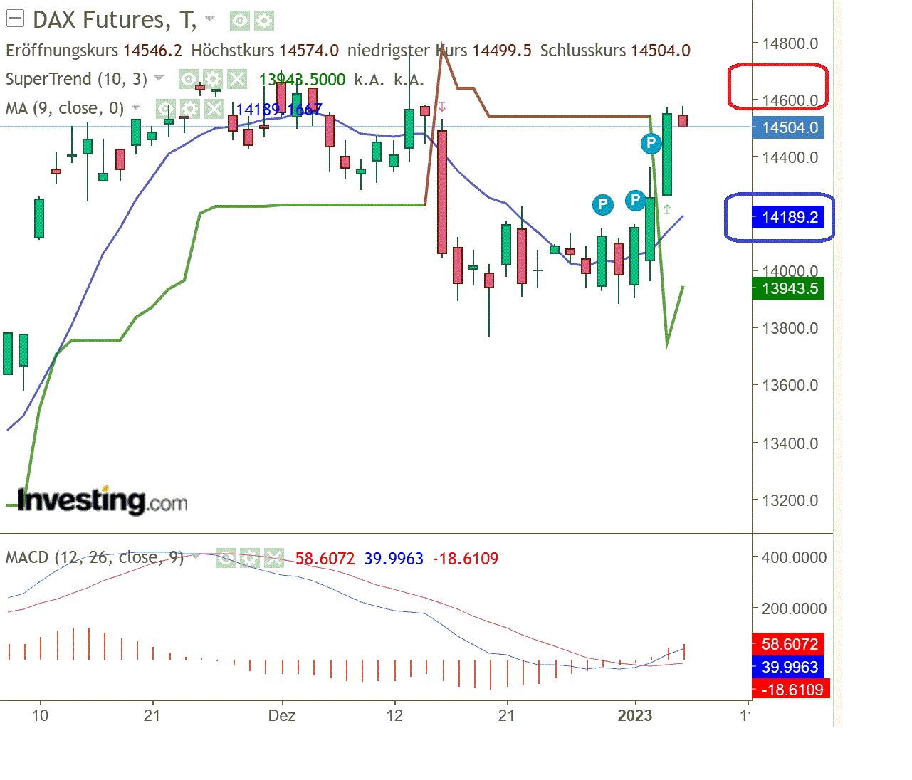 "Die Annahme war, dass der DAX oberhalb der Aufwärtstrendlinie weiter in Richtung 14338/14468 laufen könnte. Der DAX startete mit einem Gap Up und erreichte ein Hoch bei 14492.