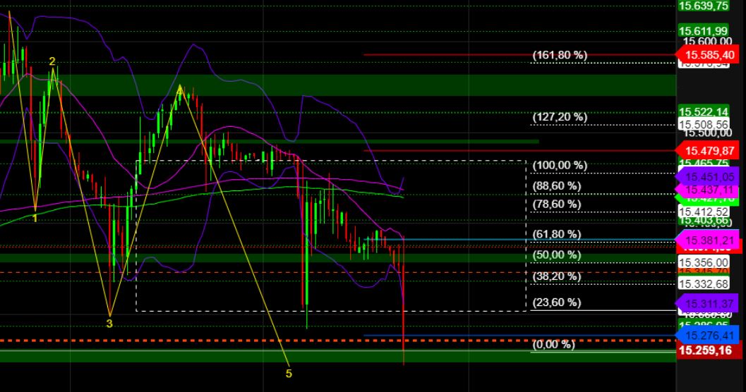 Überspringt der DAX direkt die Hochs 15634/15658 könnte die Trendfortsetzung aufwärts in Richtung 15736/15885/15913/16xxx führen."