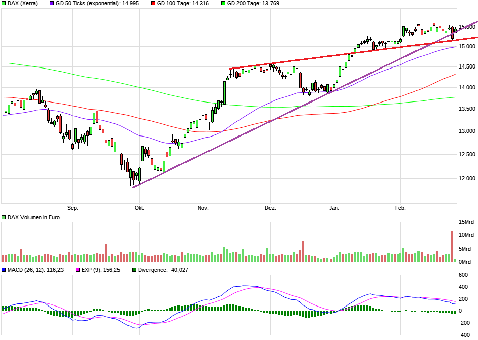 "In der Eurozone ist das Industrievertrauen im Februar auf 0,5 Punkte zurückgegangen von 1,3 Punkten im Januar. Experten hatten mit einem Wert von 2,0 Punkten gerechnet. Das Dienstleistervertrauen ging von 10,70 Zähler im Januar auf 9,50 Zähler im Februar zurück. Die Erwartungen lagen hier bei 12,40 Zählern.