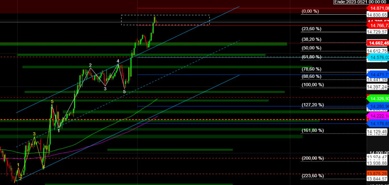 Der S&P 500 lief am Freitag ähnlich sauber wie der Dow Jones. Der Index verteidigte den Aufwärtstrend der Vortage und arbeitete sämtliche Aufwärtspfeile bis zur Zone 3.906 bis 3.918 Punkten ab. Das Tageshoch lag exakt bei 3.906 Punkten.