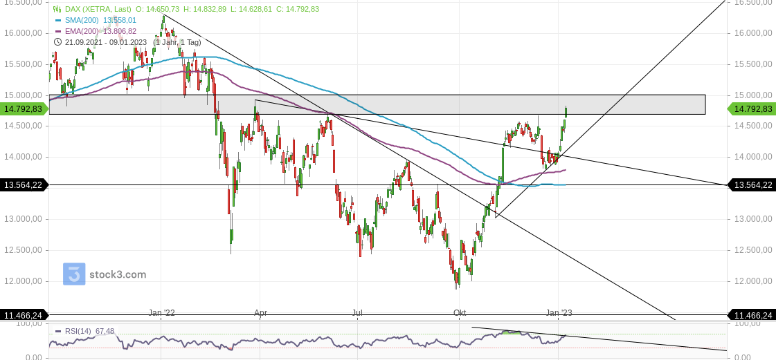 Auch hat der Dow Jones die Triggerlinie einer kurzfristigen Topformation aus November/Dezember 2022 erreicht, die als Widerstand dient. Eine Rückeroberung wäre positiv und könnte weiteres Potenzial in Richtung 33.900 Punkte freisetzen. Kommt es heute im Bereich von 33.730 Punkten dagegen zu Abprallern gen Süden, könnten sich im Falle eines Pullbacks zwischen 33.437 und 33.388 Punkten wieder neue Chancen ergeben.