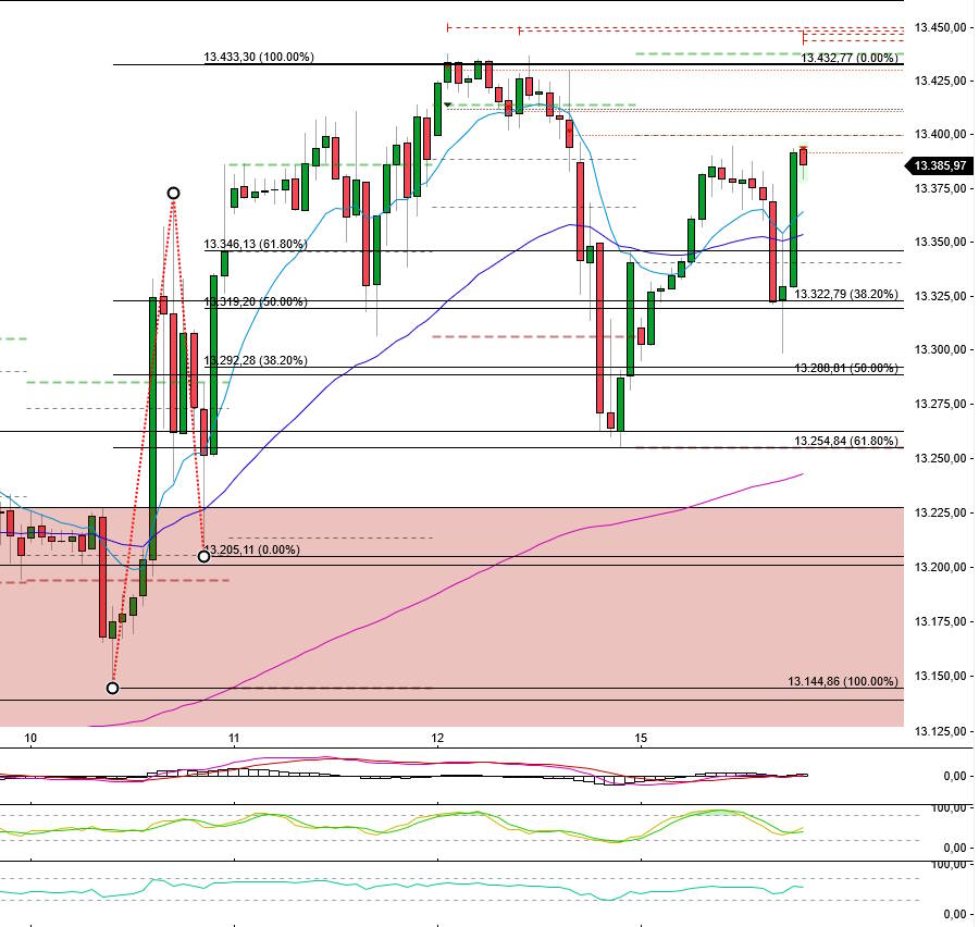 Der Nasdaq 100 enttäuschte zum Schluss der Vorwoche vollends. Der Index eröffnete leicht im Plus, wurde anschließend aber deutlich abverkauft. Die Unterstützungszone um 13.200 Punkte erreichte der Index aber nicht.