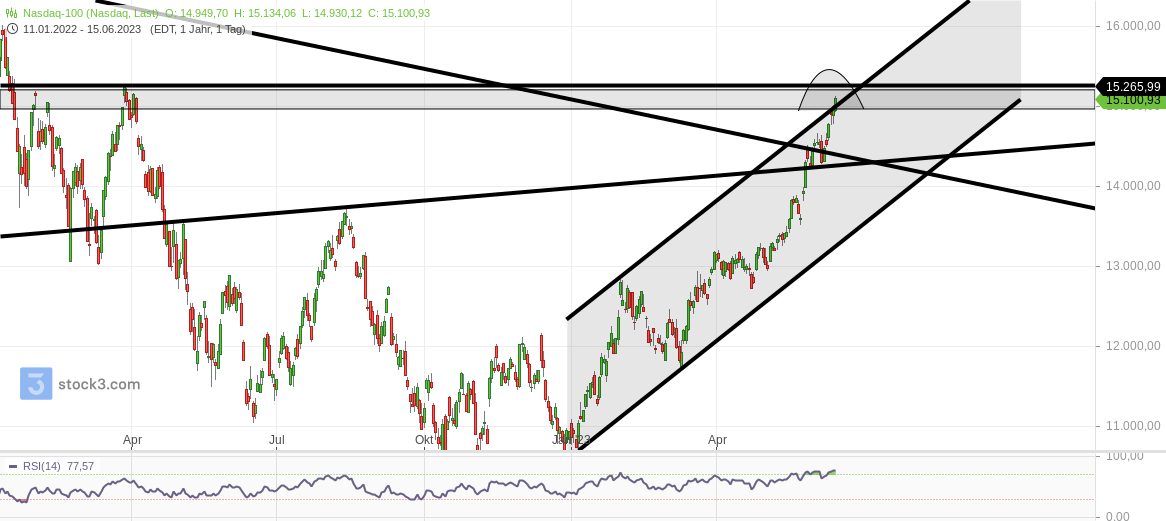 S&P500 dank der Top7 Aktien 2023 nun zum 4.400 aufsteigen lassen. Dennoch kaum Marktbreite und unter fundamental schwachen Wirtschaftsaussichten dann wieder stark Korrektur gefährdet.
