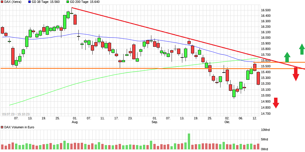 Zum Wochenschluss zeigten sich noch einmal die Bären und drückten den DAX® in den Bereich der Vorwoche. Damit bleibt der kurzfristige Abwärtstrendkanal intakt. Am Freitag verletzte der Index die Unterstützungsmarken bei 15.271 und 15.350 Punkten und könnte damit eine weitere Verkaufswelle bis 14.947/15.036 Punkte auslösen. Kaufsignale zeigen sich frühestens oberhalb von 15.628 Punkten mit der Chance auf eine Erholung bis 15.806/15.987 Punkte. "