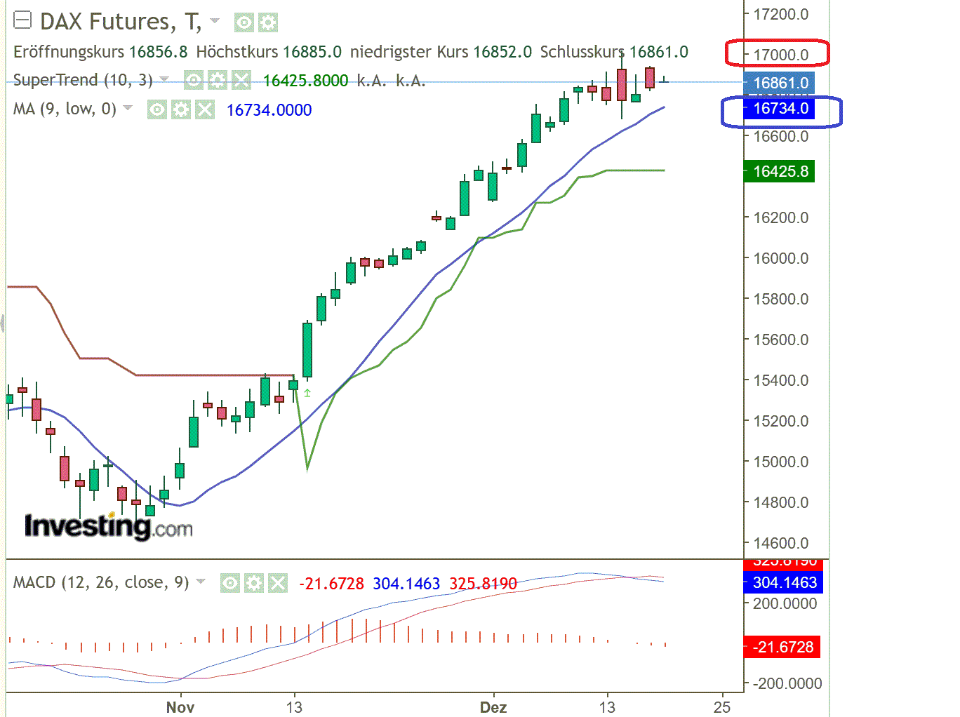 Der Nasdaq 100 scheiterte am Freitag am Vortageshoch bei 16.660 Punkten, obwohl er kurzzeitig minimal darüber notierte. Der anschließende Rücksetzer war aber deutlich kleiner als der Rückschlag am Donnerstag. Im später Handel näherte sich der Index sogar wieder dem Tageshoch an.