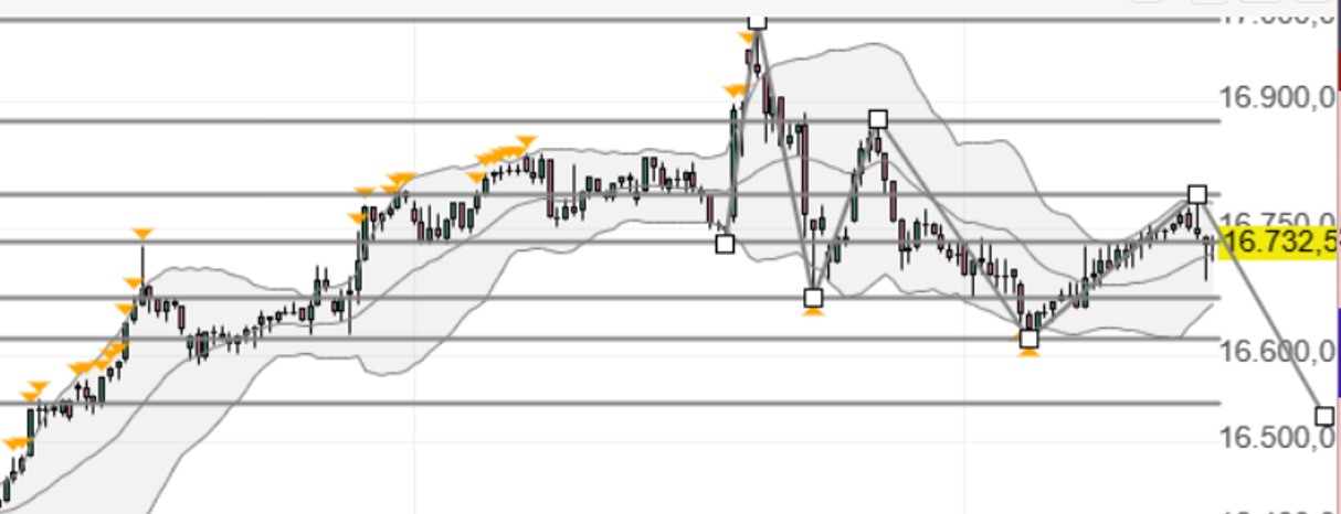 Die Rally im Nasdaq 100 ist intakt, aber sehr weit fortgeschritten. Der Index hat aber zunächst noch Potenzial in Richtung 16.970-17.000 Punkte. Sollte der Index allerdings unter 16.660 Punkte abfallen, könnte es zu einer Konsolidierung in Richtung 16.454 und 16.166 Punkte kommen.