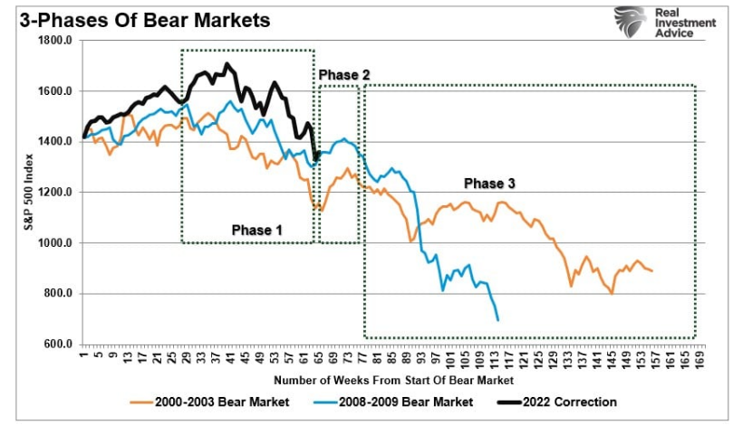 The chart below compares the 2000 “Dot.com” and 2008 “Financial Crisis” superbubbles. To Jeremy’s point, there are indeed some very concerning similarities."