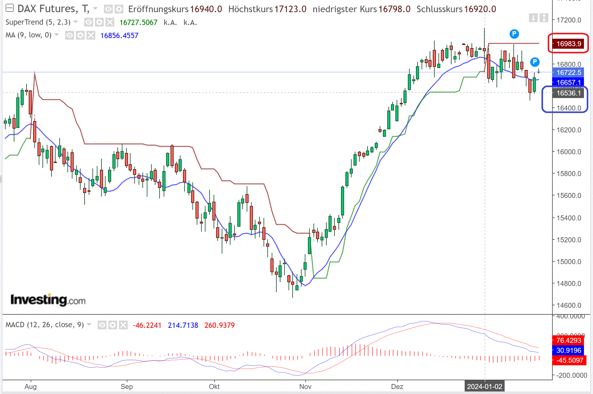 "Die Anteile von Apple waren im letzten Jahr einer der großen Treiber der Rally an den US-Märkten und konnten in der Spitze bereits im Juni über ihr bisheriges Rekordhoch bei 182,94 USD ausbrechen und an das Kurszielgebiet bei rund 198,00 USD steigen. Nachdem die Aktie aber in einem zweiten Ausbruchsversuch Mitte Dezember wiederum an der Zone gescheitert war, könnte der Titel jetzt zum Bremsklotz der US-Indizes werden.