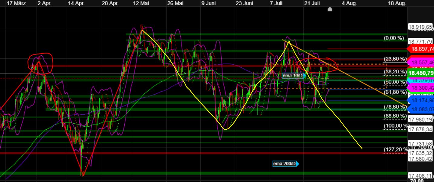 Der Nasdaq 100 befindet sich in einem intakten Abwärtstrend und hat in dessen Verlauf eine SKS-Topformation mit einem Ziel bei 18.327 Punkten vollendet. Dieses Ziel ist noch nicht erreicht. Aber die Bewegung seit dem Tief vom Donnerstag kann als Bodenbildungsversuch gewertet werden. Um diesen erfolgreich abzuschließen, müsste der Index stabil über 19.227 Punkte ausbrechen. Das rechnerische Ziel läge bei 19.803 Punkten.