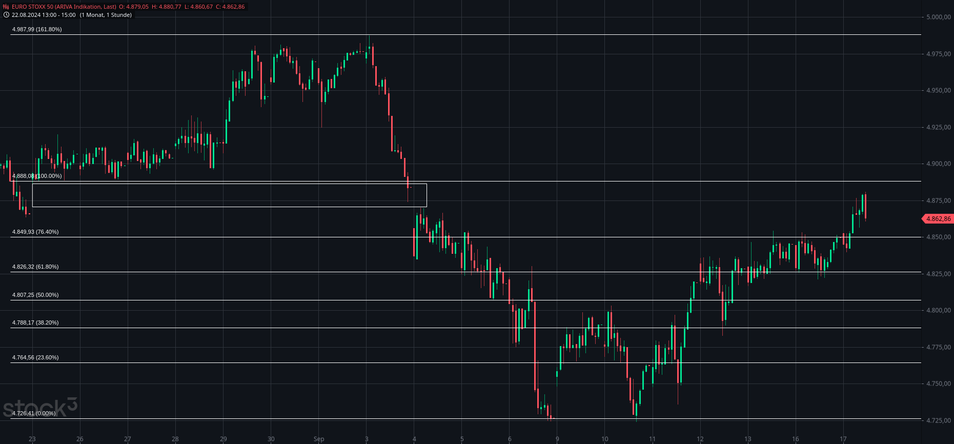Im Bereich dieser Trendlinie läuft jetzt eine Seitwärtskonsolidierung, welche aktuell die Züge einer bullischen Dreieckskonsolidierung trägt. Das sehr kurzfristige Chartbild ist mit der mehrstündigen Seitwärtskonsolidierung neutral zu werten, im bullischen Szenario handelt es sich dabei um eine kleine Fortsetzungsformation.