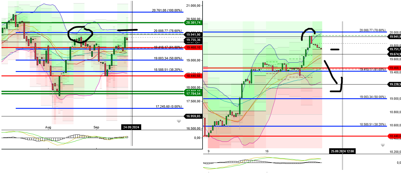 Eingekreist habe ich im linken Daily Bild das Hoch vom 22.08 19941, rechts im 4h standen wir zum Zeitpunkt des Beitrags ziemlich genau am Daily PivotPoint, der ist bei mir heute @19747.