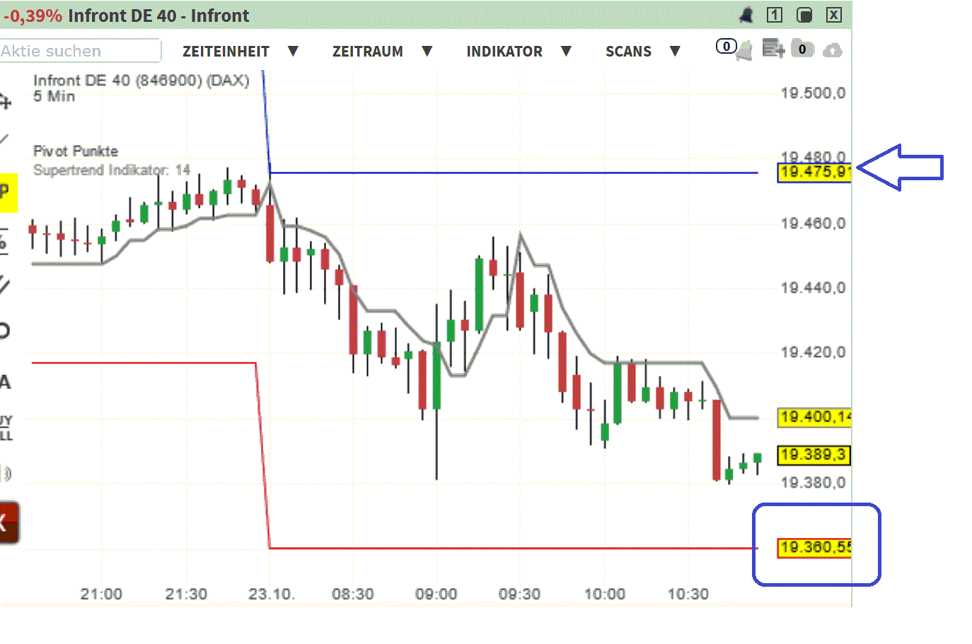 Der DAX hat ein ordentliches Abwärtspensum von 19.675 zu 19.369 zurückgelegt. In einigen Fällen reicht das als belastbares Tief bereits aus. Unterhalb von 19.588 bleibt der DAX jedoch vorerst im Abwärtstrend. Der DAX könnte am Morgen bei 19.463/19.469 scheitern und bis 19.400 fallen. Ab 19.400 dürfte sich der DAX erneut aufraffen, um abermals etwas zu steigen, erneut zu den Hochs der letzten Stunden bei 19.463/19.469."