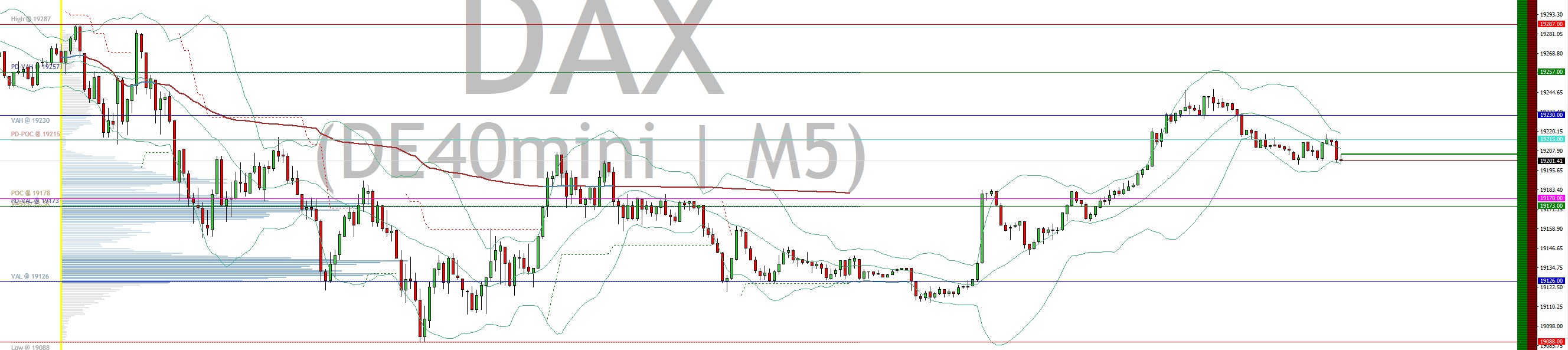 Der DAX orientierte sich gestern nach einer freundlichen Eröffnung südwärts und sank bei nur geringer Dynamik vom Tageshoch bei 19.279 Punkten bis auf ein am Nachmittag verzeichnetes 2-Tages-Tief bei 19.092 Punkten. Nach der Ausbildung einer bullishen Hammer-Kerze im Stundenchart konnte sich der Index erholen und dämmte die Tagesverluste bis auf 23 Punkte ein.