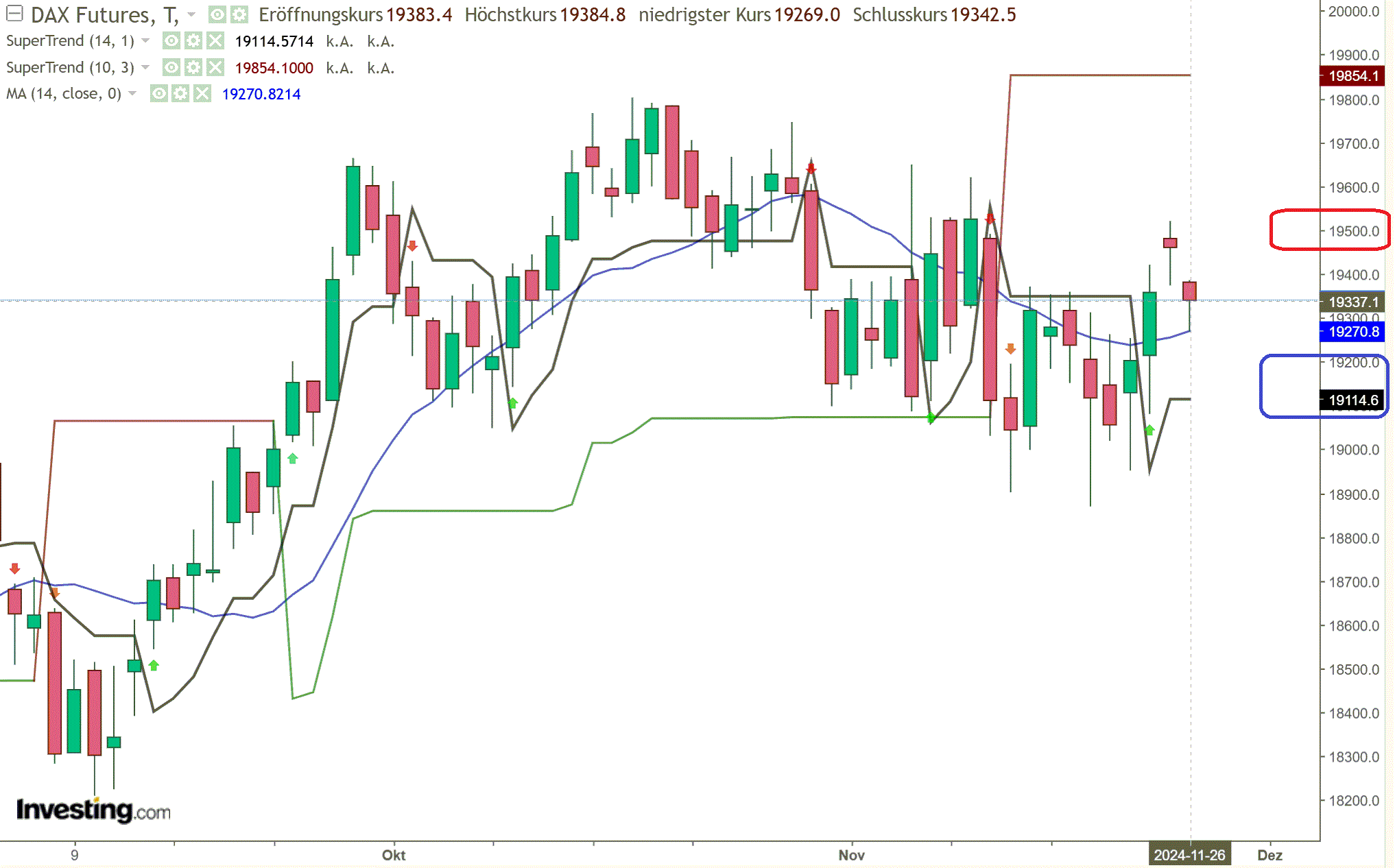 Der DAX dürfte heute leicht unterhalb des Triggerbereichs des Doppelbodens seit Mitte November in den Handel starten. Kritisch ist das allerdings noch nicht, überschießende Pullbacks als Korrektur des steilen Anstiegs seit Mittwoch könnten sogar bis 19.199 - 19.229 oder 19.146 reichen. Im bullischen Szenario erfolgen jedoch recht schnell ein bullisches Reversal und eine Rückkehr über 19.340 Punkte. Dann könnte das heutige Gap geschlossen werden, ein neuer Anlauf auf die Hürde bei 19.437 - 19.468 sollte dann folgen. Oberhalb von 19.468 lägen bei 19.550 - 19.564 und am Allzeithoch bei 19.675 Punkten die nächsten Hürden."