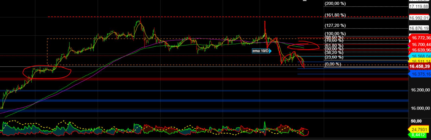 - Heute deutet eine schwache Vorbörse wieder deutliche Abschläge an. Bei größerer Schwäche liegen bei 16.450 - 16.465 und optional 16.390 bzw. 16.280 - 16.290 weitere Auffangzonen. Spätestens dort werden starke bullische Reversal denkbar.