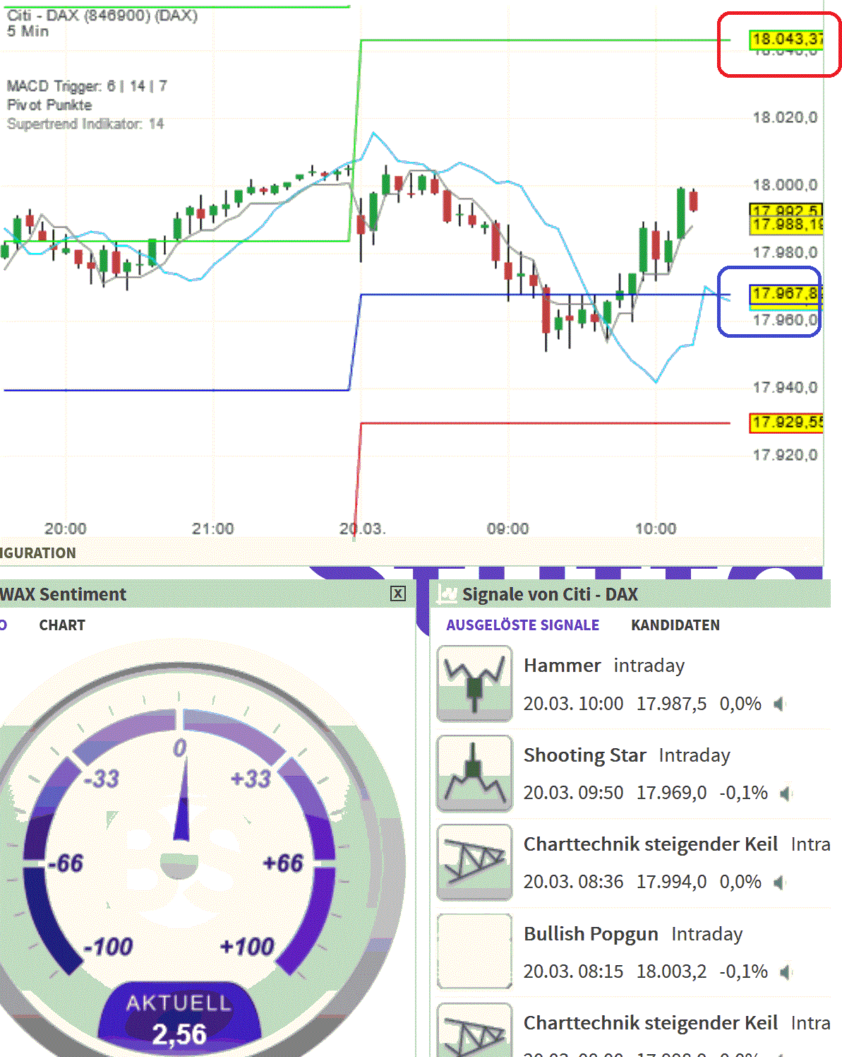 Bärisch: Charteintrübungen finden nur unter 17915/17900 statt. Unter 17900 würde der DAX bis 17650/17620 fallen. Ab 17650/17620 könnte der DAX dann wieder deutlich, für mehrere 100 Punkte nach oben kontern.