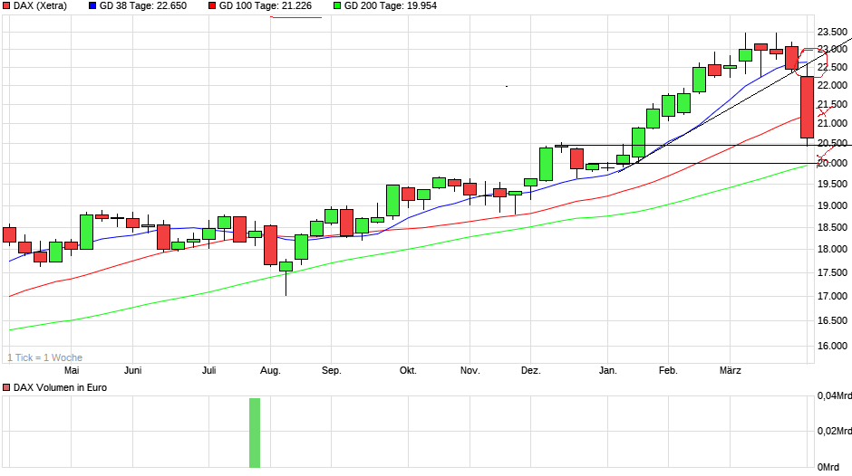 Der aus der Rallye bis über die 23.000er-Marke angestaute Abwärtsdruck hat sich in der vergangenen Woche Bahn gebrochen und mit einem Verlust von über 2.100 Indexpunkten nahezu die gesamten Jahresgewinne aufgezehrt. In der Endphase hat der Kurs das Vorjahreshoch respektiert und im Stundenchart ein Double-Bottom-Signal generiert. Hier könnte sich im Idealfall zum Start in die neue Woche am Montag eine Gegenbewegung einstellen, die zumindest das Februarhoch in Augenschein nehmen dürfte. Ein Bruch des Vorwochentiefs würde hingegen nahe Ziele im Bereich von 19.900 Zählern aktivieren.