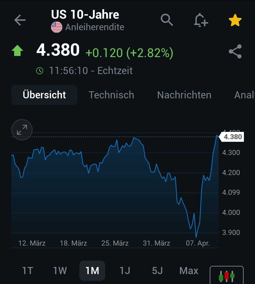 Der Zollkrieg zwischen den USA und China eskaliert weiter. Ein Zoll von 104% bedeutet m.E. , dass es bald keine Waren mehr aus China in den USA geben wird. Wir sehen viele Firmen, die Auslieferungen in die USA gestoppt haben, darunteer z.B. Nintendo, Audi und VW. Jetzt werden erstmal die Läger geleert. Audi hat wohl für 2 Monate genug auf Lager und man hofft, dass es bis dahin zu einer Lösung kommen wird. Für Amerikaner werden nicht nur die Preise höher; viel schlimmer ist, dass sie bald vor leeren Regalen stehen werden. Trump möchte jetzt auch Sonderzölle auf Pharma einführen. Pfizer hat inzwischen eine Dividendenrendite von 8%, einstelliges KGV. Man reibt sich manchmal nur noch verwundert die Augen. Trump geht das Risiko ein, dass es bald keine Medikamente mehr in den USA gibt. Ein solches Chaos habe ich noch nie gesehen. Wenn man dieses Chaos betrachtet ist beim DAX eigentlich noch nicht viel passiert. Man will es wohl nicht glauben, dass es so schlimm kommt.