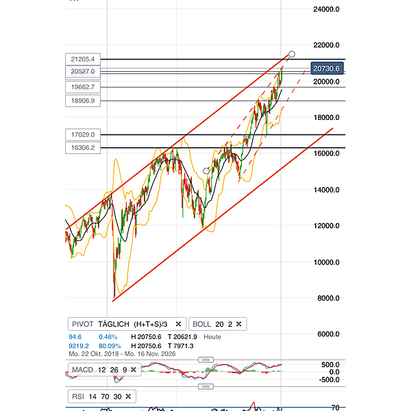 Der Index gönnt sich eine Verschnaufpause auf hohem Niveau. Das ganz kurzfristige technische Bias ist zur heutigen Eröffnung neutral. Nächste Widerstände und potenzielle Ausdehnungsziele im Fall eines Ausbruches über die aktuelle Hürde bei 20.675 Punkten lassen sich bei 20.710-20.864 Punkten und 21.062/21.069 Punkten ausmachen. Ein Rutsch unter 20.580 Punkte würde derweil zunächst für eine Ausdehnung der Konsolidierung mit möglichen nächsten Auffangbereichen bei 20.522-20.545 Punkten, 20.445/20.480 Punkten und 20.427/20.428 Punkten sprechen."