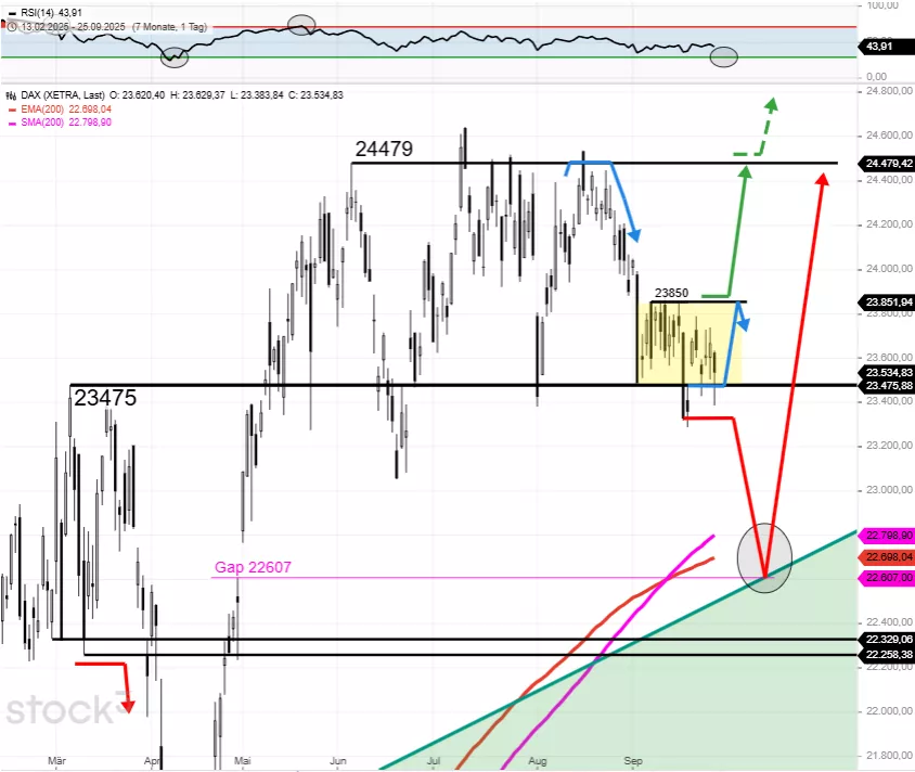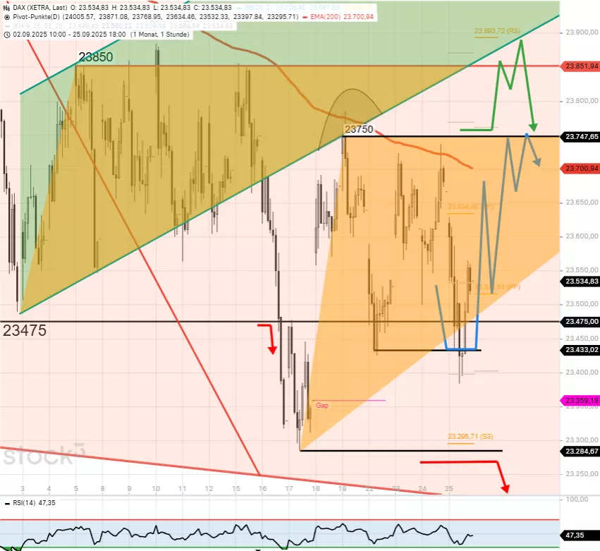 Da der DAX jedoch weiterhin zu großen Teilen des Tages über 23.475 taktet, gibt es DAX Aufwärtschancen bis 23.750 bzw. 23.850. Kleine intra day DAX Widerstände stellen heute 23.610 und 23.700 dar. Kleine intra day DAX Unterstützungen lassen sich heute bei 23.560/23.550 und 23.430 ableiten. Unterhalb von 23.300 schaltet sich die große Herbstzielzone 22.800/22.600 frei. Nur nach DAX Tagesschlusskurs über 23.850, wäre der Abwärtstrend der letzten Wochen gestoppt und der DAX könnte im Zuge dessen bis 24.480 steigen."