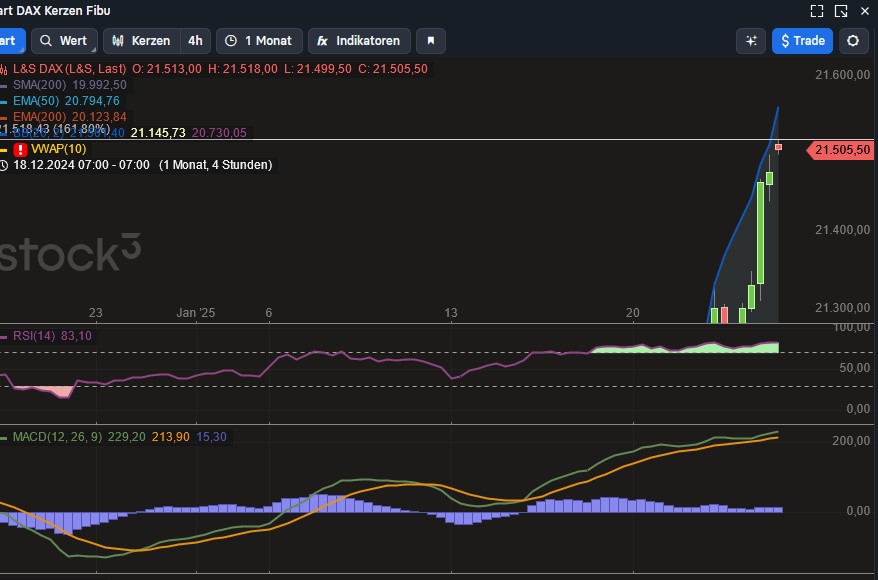Der DAX blieb auch gestern fest in der Hand der Bullen. Er schraubte sich ohne nennenswerten Rücksetzer bis auf ein in der letzten Handelsstunde verbuchtes Allzeithoch bei 21.423 Punkten hinauf.