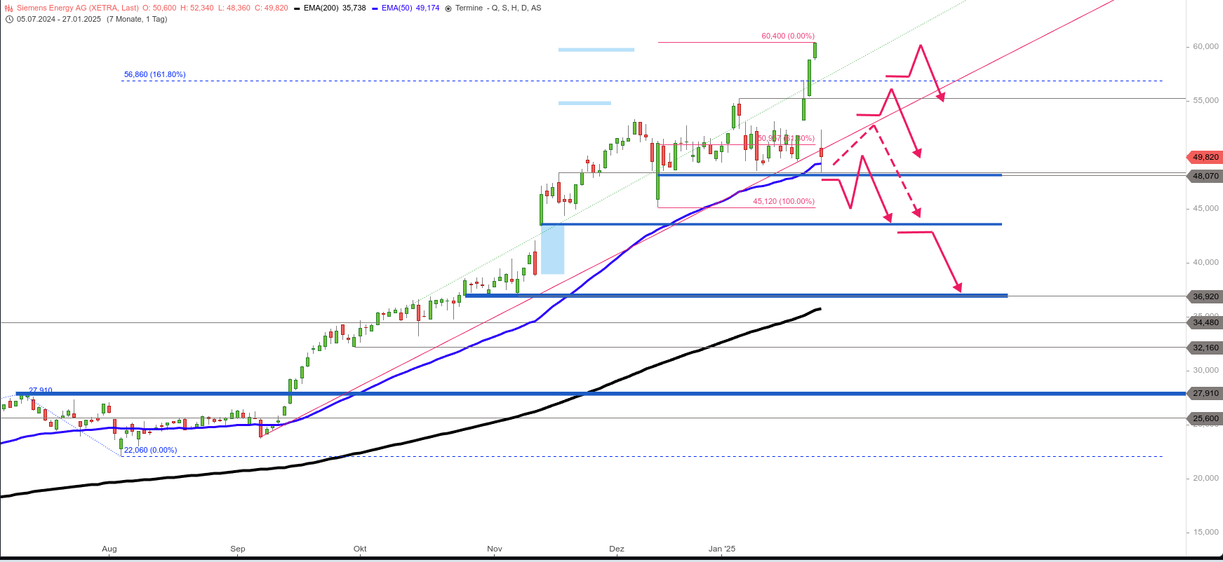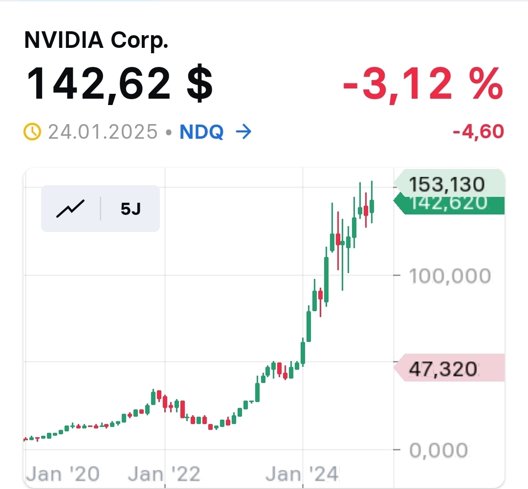 Der Nasdaq 100 bildete nach dem Allzeithoch bei 22.133 Punkten vom 16. Dezember einen bullischen Keil aus. Aus diesem brach er am 17. Januar 2025 nach oben aus und kletterte anschließend auf 21.945 Punkte. Dort setzten am Freitag Gewinnmitnahmen ein, der Index fiel auf die Unterstützungszone bei 21.722 bis 21.703 Punkte zurück. Nach der Veröffentlichung von Deepseek R1 am Wochenende geraten die KI-Werte massiv unter Druck. Der Index wird um 13.00 Uhr bei 20.886 Punkte und damit 888 Punkte unter dem Schlusskurs vom Freitag getaxt.