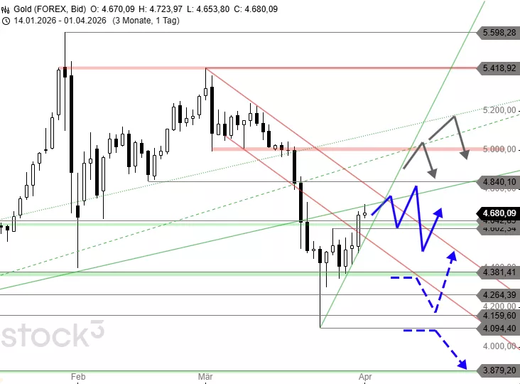Mit einem Tief bei 4.094 USD endete der massive, Anfang März begonnene Kurssturz beim Goldpreis vorerst und ging in eine dynamische Erholung über. Mit der Rückeroberung der Unterstützung bei 4.381 USD gelang der Käuferseite noch am Tag der Ausbildung des Tiefs die Rückkehr in die vorherige große Range und damit der impulsive Auftakt für einen Anstieg bis 4.602 USD. Dieses Hoch wurde im Rahmen einer zweiten Aufwärtsphase im gestrigen Handel ebenfalls durchbrochen. Die steile Erholung erreichte heute Morgen sogar schon das Kursziel bei 4.730 USD.