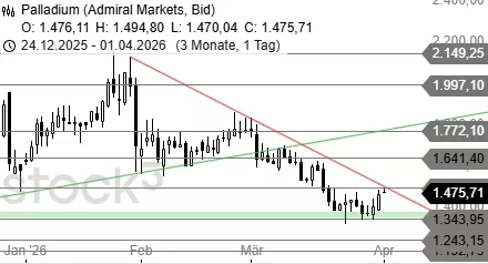 Palladium erreicht im Rahmen der kurzfristigen Erholung den Widerstand bei 1.494 USD. Wird dieser aufgehebelt, steht eine Ausweitung des Anstiegs bis 1.531 USD und 1.570 USD an. Scheitern die Bullen an der Hürde, dürfte zunächst eine leichte Korrektur bis 1.400 USD zurück führen.