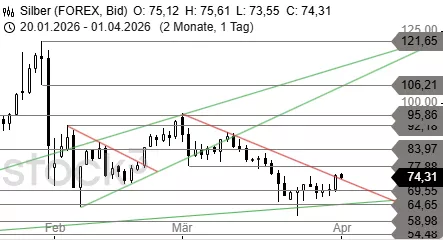 Silber hat auch den Widerstand bei 70,00 USD überschritten und steuert auf die Hürde bei 74,53 USD zu. Über der Marke wäre eine Kaufwelle bis 77,88 USD möglich. Andernfalls stünde jetzt eine erste deutliche Korrektur bis 72,00 USD an.