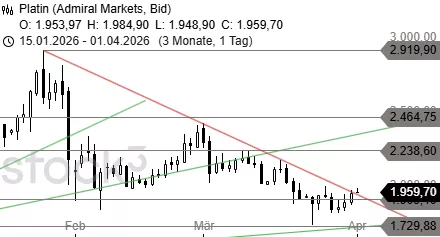 Nach dem Anstieg über den Widerstand bei 1.909 USD erreicht Platin jetzt die zentrale Abwärtstrendlinie auf Höhe von 2.015 USD. Über der Diagonale wäre eine weitere Erholung bis 2.150 USD wahrscheinlich. Dreht der Kurs dagegen an der Barriere ab, steht eine Korrektur bis 1.834 USD an.