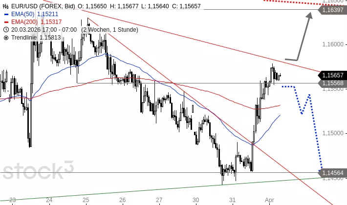 EUR/USD fiel gestern zunächst weiter zurück. Am Mittag testete das Währungspaar die Unterstützung bei 1,1456 USD und drehte dort sehr dynamisch nach oben ab. EUR/USD durchbrach einen kurzfristigen Abwärtstrend und kletterte an den Widerstand bei 1,1557 USD. EUR/USD brach in der Nacht über diese Hürde aus. Allerdings ist der Abwärtstrend seit dem Jahreshoch bei aktuell 1,1581 USD intakt.