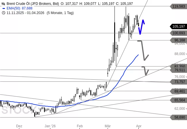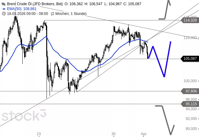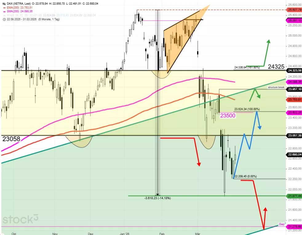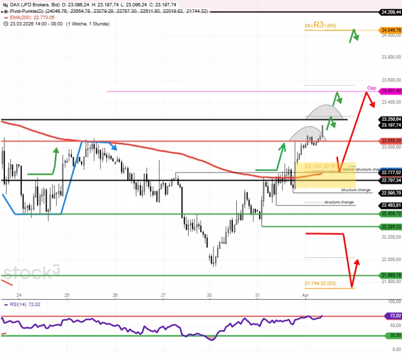 Der DAX schloss am Dienstag bei 23.016 Punkten und konnte damit die Erholung der Vortage fortsetzen. Vorbörslich notiert der Index am Mittwochmorgen bei 23.170 Punkten und tastet sich damit an den ersten Widerstand bei 23.200 Punkten heran. Der 10er-EMA bei 22.871 Punkten wurde klar nach oben durchbrochen, womit ein erstes wichtiges bullisches Signal generiert wurde. Die nächste Hürde bildet die Zone um 23.200/23.400, die als massive Widerstandszone fungiert. Das Verlaufstief der Korrektur könnte nun mit 21.860 Punkten drin sein. Dazu müsste der DAX den 10er-EMA aber im weiteren Kursverlauf weiterhin weitgehend verteidigen können. Denn es besteht immer noch die Gefahr, dass es zu einem erneuten Kursrutsch kommt und das Gap um 21.498 Punkte angelaufen wird. Das entscheidende Barometer bleibt der Ölpreis. Unter 100 Dollar bei WTI ist die Lage für Aktien relativ stabil, darüber drohen eher neue Kursabgaben. Im Chart dient der 10er-EMA als guter Signalgeber. Die geopolitische Lage zeigt leichte Entspannungssignale bei weiterhin hohem Risiko. Trump lobte Fortschritte mit einem angeblich neuen iranischen Regime und signalisierte laut Wall Street Journal Bereitschaft, den Krieg auch ohne Wiederöffnung der Straße von Hormus zu beenden. Das Ultimatum zum 6. April läuft weiter. Der Ölpreisrückgang von über 105 auf aktuell 100 Dollar WTI spiegelt die vorsichtige Hoffnung auf eine Verhandlungslösung wider.