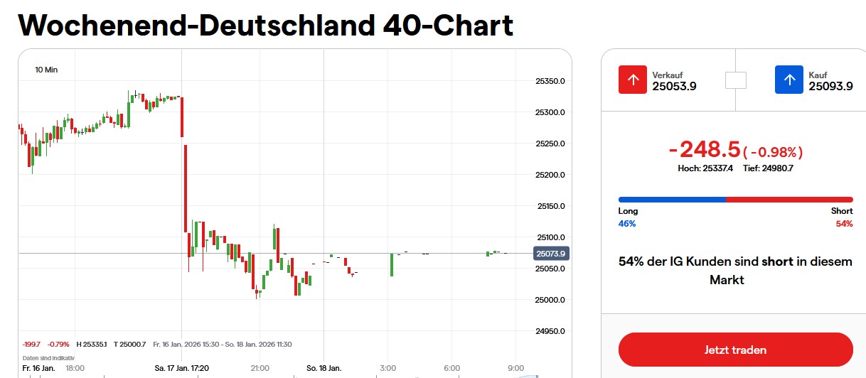 Diese positive Grundstimmung konnte der DAX in einen Ausbruch über 25.000 Punkte verwandeln, welcher in der vergangenen Woche nach einem neuen Allzeithoch an Momentum verloren hat. Zum Ende hat der Kurs die 25.200er-Marke gehalten und behält damit auch für den Start in die neue Woche am Montag weitere Zugewinne im Blick.